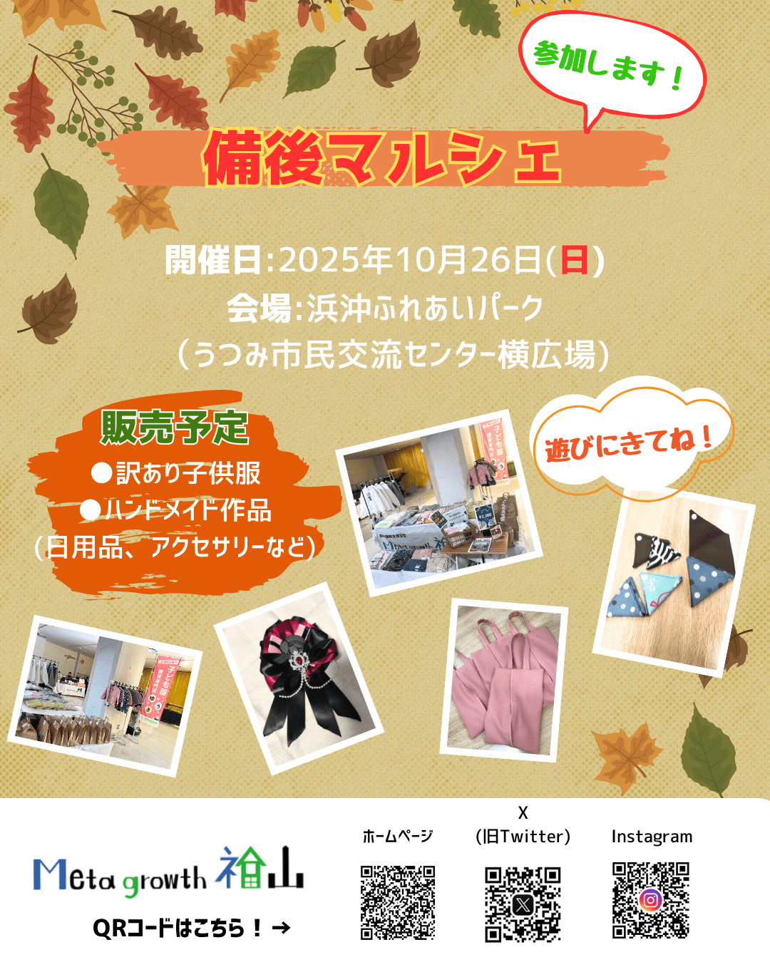 メタグロース福山は第4回備後マルシェに出店します。 当日は、利用者さんが制作した小物類の販売をします。 ▷シュシュ▷コースター▷小物入れ▷ちょうちょリボンゴム▷…